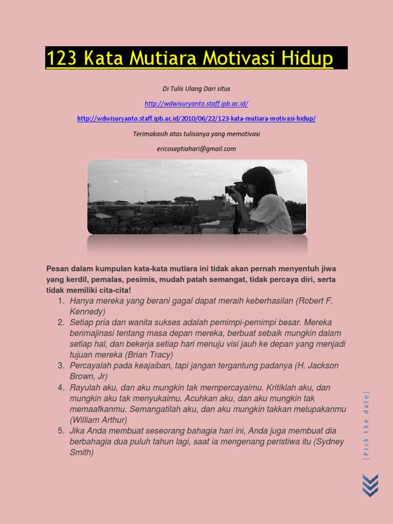 Morihei ueshiba & perkembangan hidup. Kepadamu rasa ini kulakukan kepadamu kepercayaan masa depan kita untuk menjadi hamba yang saling mengingatkan dalam kebaikan. Mereka awalnya memang mencari sebuah inspirasi kehidupan. Setiap orang pastinya memiliki sebuah masa atau waktu dimana ia merasa terpuruk. Mengapa ada orang yang hidupnya selalu terlihat tenang dan damai, sementara kita merasa kacau dan tak karuan? Kutipan kata mutiara pendek tentang kebijakan. Kata bijak atau kata mutiara bisa memberikan kita sebuah pencerahan, sebuah motivasi dalam menjalani kehidupan ini. Kata orang bijak, kita tidak pernah merasa lapar untuk 2 hal : Ingatlah, orang sukses tidak akan hanya terpaku pada hasil yang sempurna, tapi sikap terhadap proses kehidupan. Jika anda ingin kaya, lipatlah uang di dalam dompet anda. Namun, kata bijak indah untuk motivasi ini juga mempunyai sifat lebih mendorong seseorang untuk menjadi lebih baik menjadi pribadi yang positif. Janda adalah seorang istri yang ditinggal suami, entah karena diceraikan atau suami telah meninggal. Serta baca juga artikel terbaru dari kita gambar kata kata cinta seorang janda.
